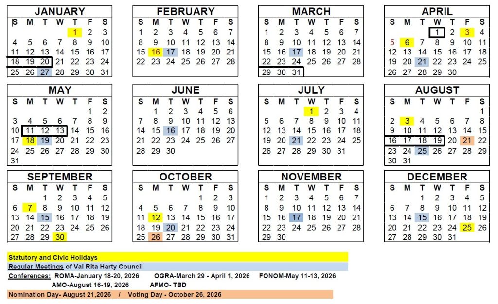 Cliquez sur l’image pour agrandir et/ou télécharger le calendrier des réunions municipaux pour 2026 /// click on the image to view or download the 2026 Council meeting calendar.